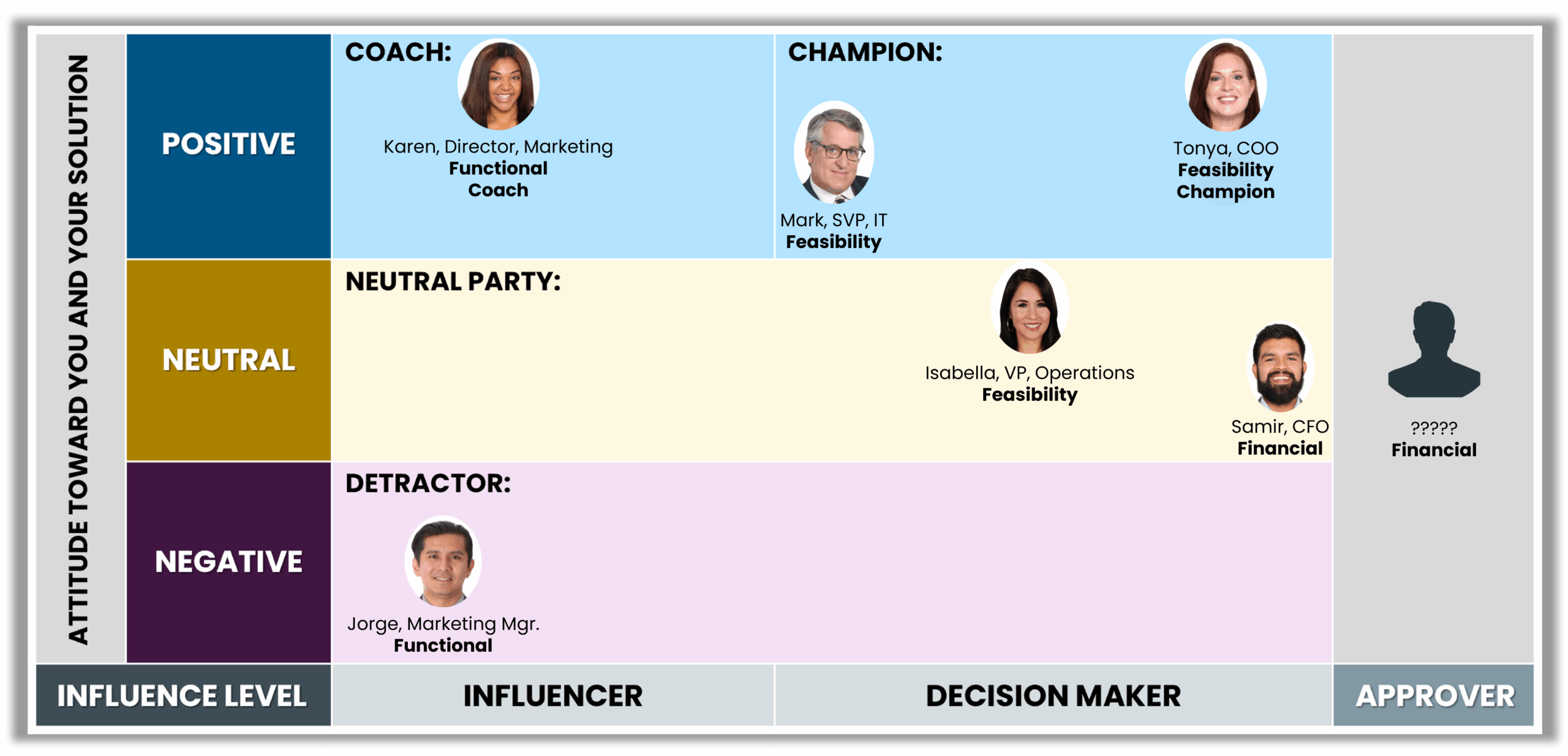 - Buyer Landscape Analysis: Map out the buyer landscape to understand the dynamics of relationships within the account. Identify champions, coaches, detractors, and other influencers and their roles. This is something else we do in Modern Sales Foundations that I have seen make a significant difference in building effective account plans.