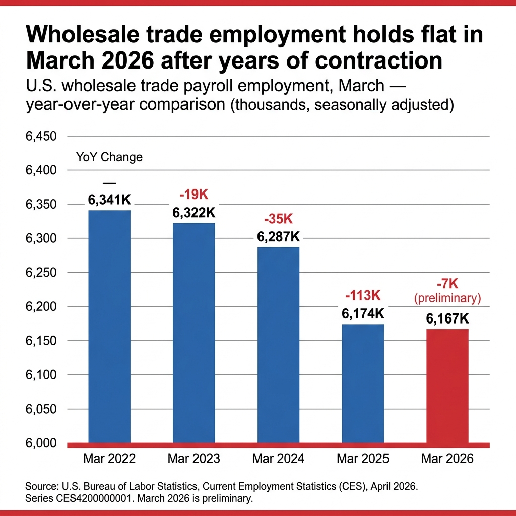 Employment in wholesale trade declined by 13,900 jobs in March, one of the sharper pullbacks among major industries and a notable reversal from the more stable hiring patterns seen earlier in the year.