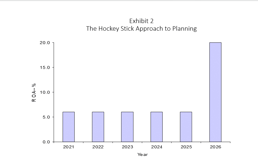 As can be seen in Exhibit 2, this is what is typically called the hockey-stick approach to profit improvement. The long-term trend is going to be shattered in one year. Forget the twenty-year history of steady performance. This is the year!