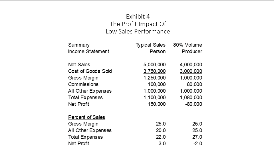 In reality, the impact of somewhat mediocre performance, even with commissions, is dramatic, as shown in Exhibit 4. The exhibit assumes that a typical sales rep is responsible for $5.0 million in revenue with a gross margin of 25.0%. More importantly, the reps receive 8.0% of the gross margin in commissions. All other costs are 20.0% of sales producing a profit of 3.0%.