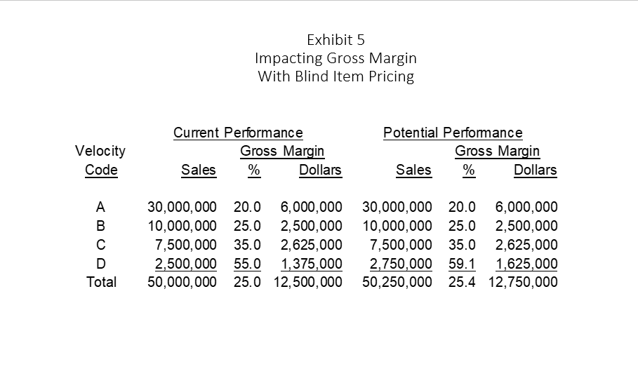 Specifically, the exhibit looks at a velocity code mix of A items though D items. On the left side of the exhibit, the A items are the fastest selling by far (50.0% of total sales), but carry the lowest gross margin percentage. They are highly competitive as customers buy them frequently. The word commodity comes to mind.