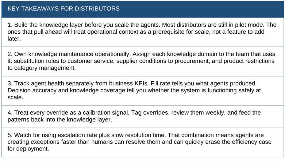 The distributors that get durable value from agentic AI will not be the ones that moved fastest. They will be the ones that built the knowledge layer first and the oversight discipline alongside it: a governed operational context layer that keeps agents informed, and a health-metric framework that keeps operators in control.