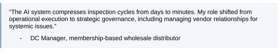 At one large wholesale distributor, computer vision monitored inventory flow and routine claims were resolved autonomously by adjusting inventory, issuing supplier claims, and notifying stakeholders without human initiation. Inspection cycles compressed from days to minutes. The DC manager described the role shift directly: