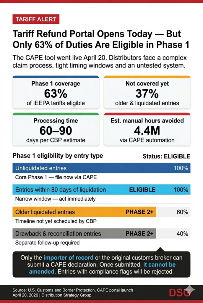 Why This Matters to Distributors: The CAPE portal gives distributors a formal path to recover IEEPA tariff costs that squeezed margins for the past year — but only importers who act promptly maintain clean entry records and coordinate early with customs brokers are likely to see refunds quickly.