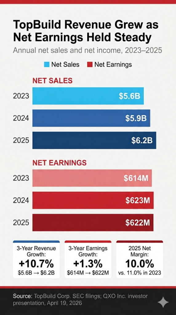 QXO’s existing operations contributed $11.9 billion in revenue in 2025 across 700 branches and 13,000 employees. TopBuild’s 450 branches and 15,000 employees double QXO’s reach.