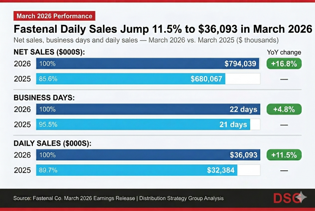International operations reinforced the breadth. Fastenal’s European and Asian businesses grew 24% in March. Watts attributed the momentum to demand for the company’s on-site model. “Our solutions, our local presence and our supply chains are definitely in high demand,” he said.