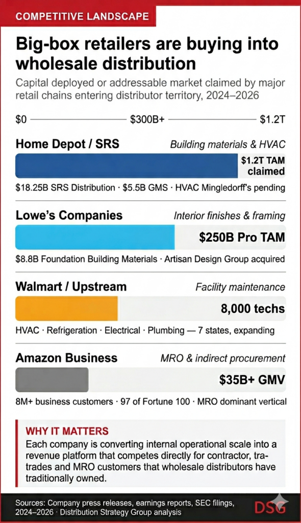 Why This Matters to Distributors: Home Depot, Lowe’s and Walmart are no longer just retailers competing at the margin of the distribution business. They are making multi-billion-dollar structural moves into the core contractor, MRO, and facility maintenance markets that wholesale distributors depend on — and the pace is accelerating.