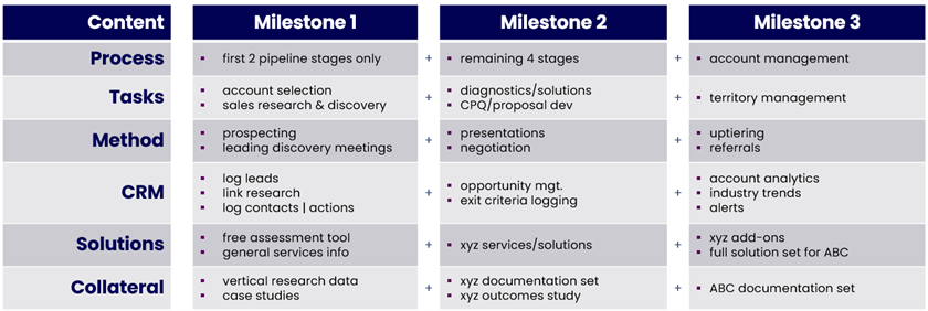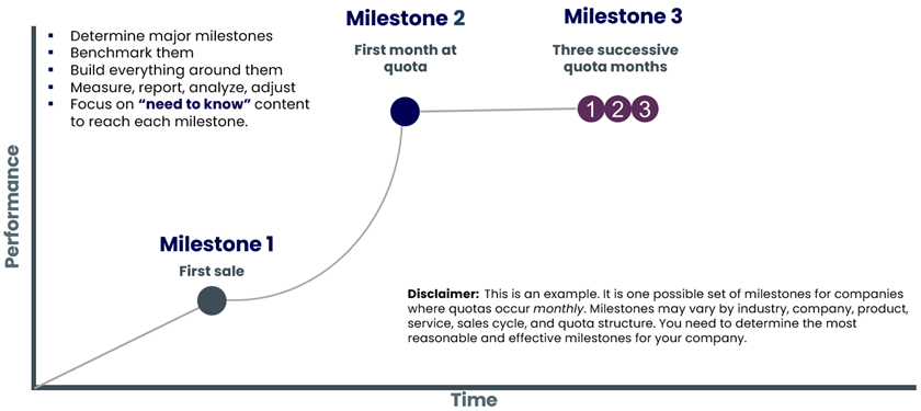 For shorter sales cycles, common examples include the first sale, first month at quota, and three successive months at quota. For longer cycles, expand the count and interval. Track leading and lagging indicators for both learning and selling on the way to each milestone.